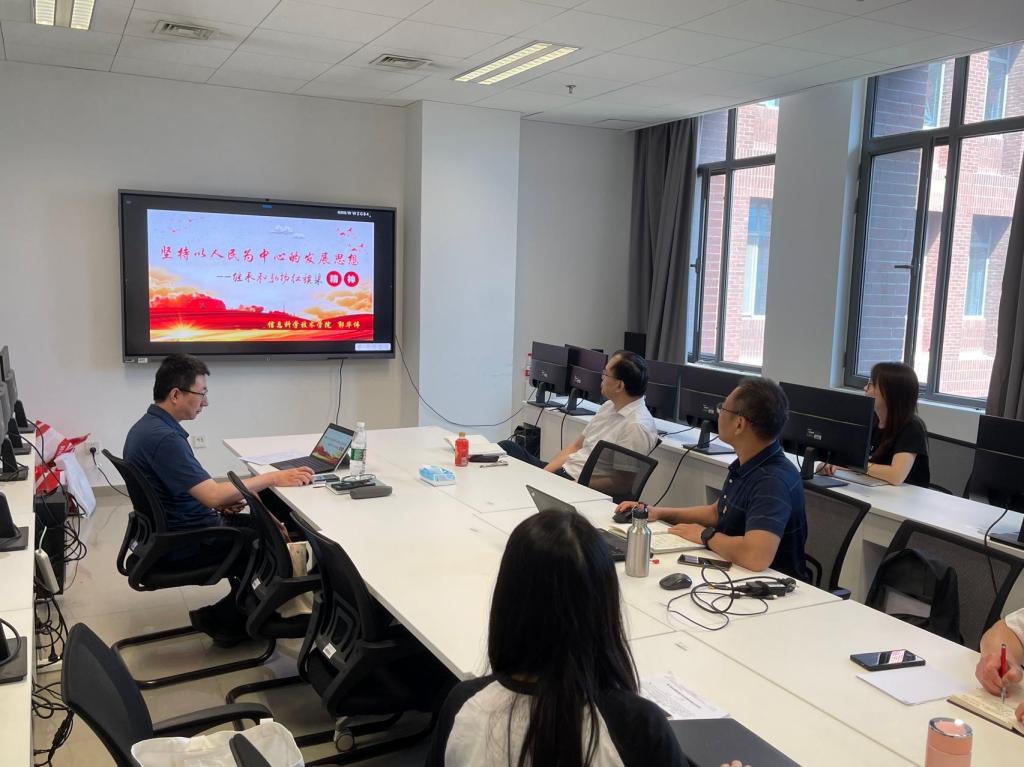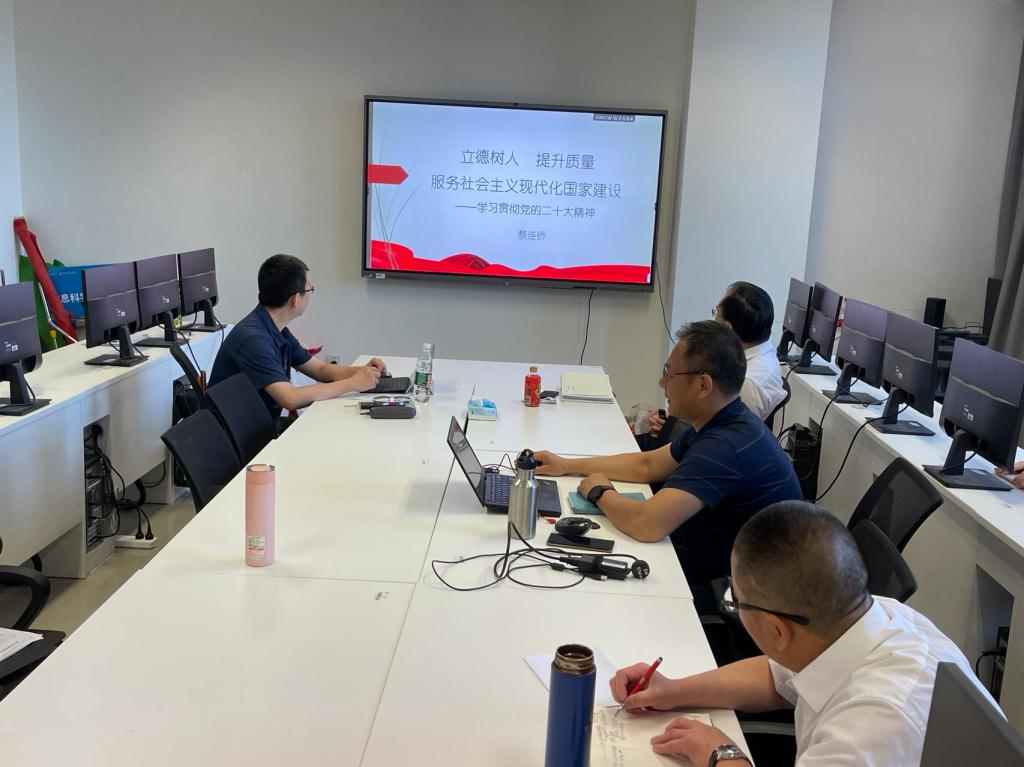 首先由院长蔡连侨讲授了主题为“立德树人 提升质量 服务社会主义现代化国家建设-学习贯彻党的二十大精神”的党课。蔡连侨首先带领大家回顾了二十大报告的主要内容,特别就其中实施科技兴国战略,强化现代化建设人才支撑部分做重点解读。教育、科技、人才是全面建设社会主义现代化国家的基础性、战略性支撑,必须坚持科技是第一生产力、人才是第一资源、创新是第一驱动力,深入实施科技兴国战略、人才强国战略、创新驱动战略,开辟发展新领域新赛道,不断塑造发展新动能新优势。然后结合学院发展目标、学科专业特点以及教师学生工作等方面就如何办好人民满意的教育、完善科技创新体系、加快实施创新驱动发展战略、深入实施人才强国战略做了深入阐述。