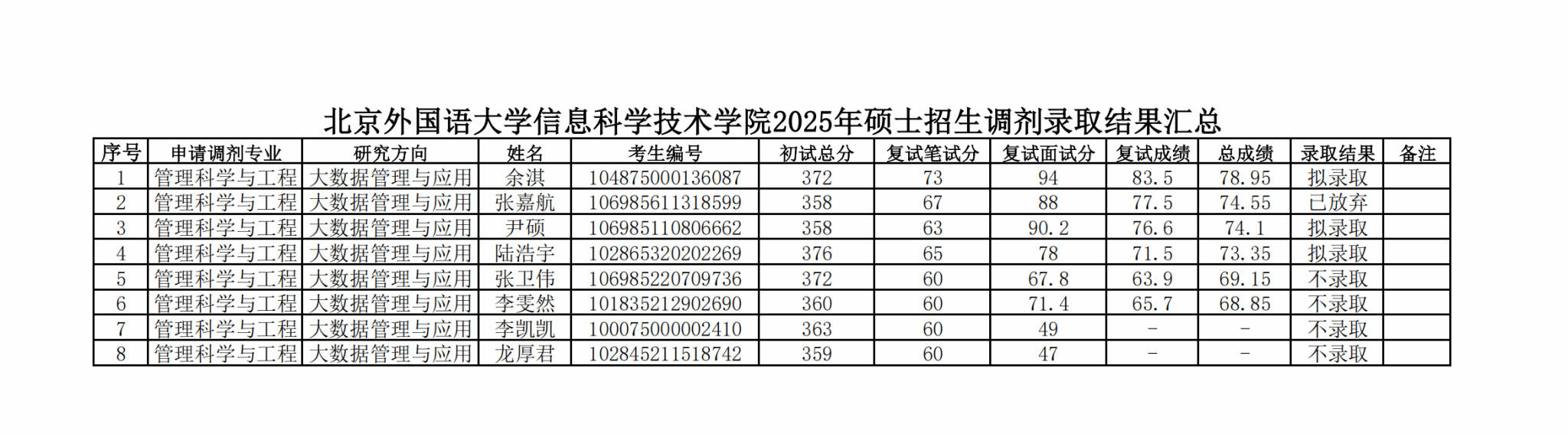 澳门网投官方网站2025年硕士招生调剂复试拟录取结果