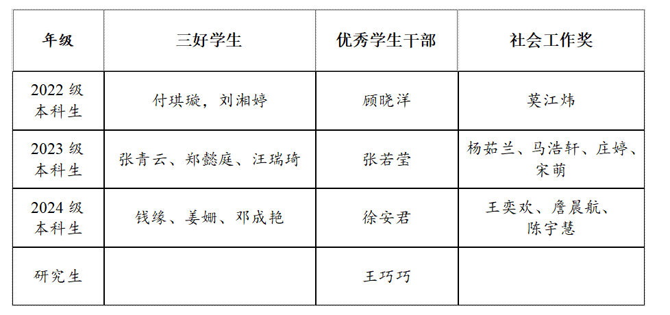 根据《澳门网投官方网站学生资助工作管理规定》《澳门网投官方网站学生评优工作条例》,结合学校《关于开展2024-2025学年三好学生、优秀学生干部、社会工作奖评审工作的通知》具体要求,经学生个人申报、班级推荐审核、学院评奖评优工作领导小组审定,学院2024-2025年度三好学生、优秀学生干部、社会工作奖评审结果如下(排名不分先后):
