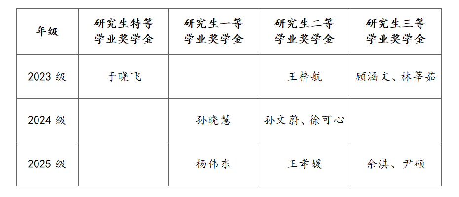 根据《澳门网投官方网站学生资助工作管理规定》、《澳门网投官方网站研究生学业奖学金评审办法(试行)》、《澳门网投官方网站研究生学业奖学金评审指标体系(实行)》,结合统考生评审指标及办法,经学生个人申报、班级推荐审核、团总支学生会汇总、学院评奖评优工作领导小组审定,学院2024—2025年度研究生学业奖学金评审结果如下(排名不分先后):